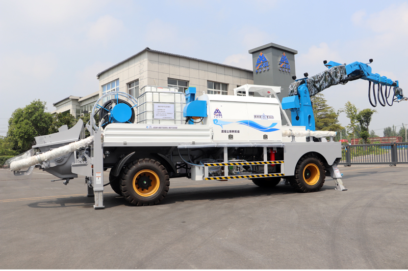 全液壓伸縮噴射臂適用于長距離、大高度濕噴場地。前置的機械臂相較汽車底盤噴射機組,具有臂架噴射范圍更大,噴射盲區小的特點。